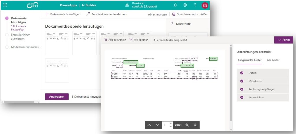You should have many documents with the same layout but with different data to generate and to train the model. After uploading the first documents, you can analyze the contained information. The AI Builder suggests the identified data fields and you can select which information is relevant for your purpose. If you have more documents, you can use them to train your model but you are limited to the possibilities of the AI Builder concerning the detection of contained data fields.