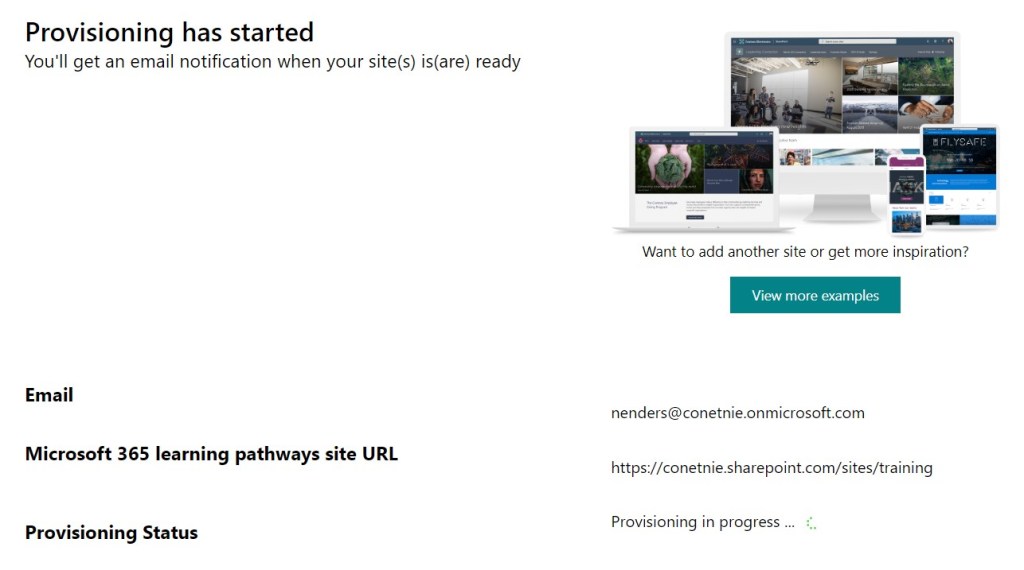 You can close the appearing confirmation page because you will get an information via email and the provisioning process will take some minutes. When you receive your confirmation email, you can click the button “Open Site” and access your new learning platform.
