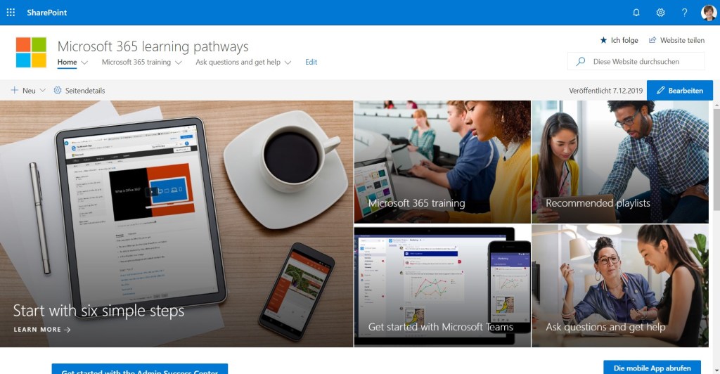 When you navigate to your new website, you will find the draft version of your corporate learning platform with some default training material for SharePoint, OneDrive and Teams. But it still needs some adjustments.